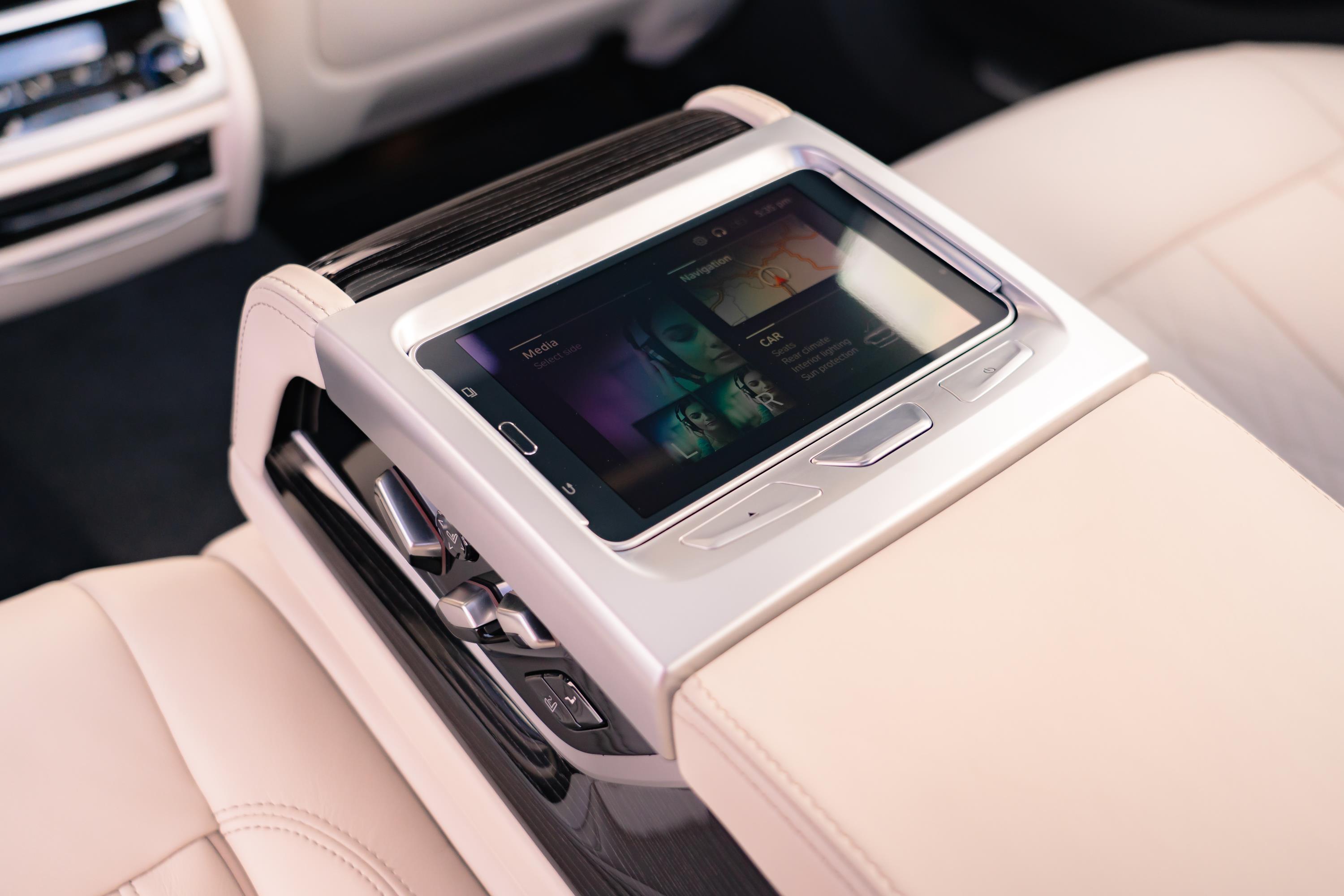The new BMW 7 Series also includes the latest version of the BMW Touch Command unit. This removable tablet with a 7-inch screen can be used from any seat and even outside the vehicle. It lets the occupants operate comfort functions such as seat adjustment, interior lighting and climate control, as well as the infotainment, navigation and communication systems. It can also be used to play external audio and video files. The graphics and menu system of the BMW Touch Command tablet and the rear-seat entertainment Experience displays are now aligned with the software features and functionality of BMW Operating System 7.0, which is also used for the all-digital displays of the instrument cluster and Control Display.